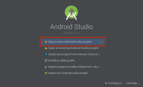 Open Android Studio 3.0.1 or later and select Start a new Android Studio project from the Quick Start menu, or choose File/New Project…:
